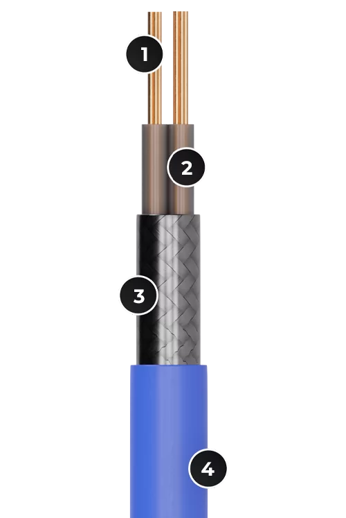 Двуслойная изоляия кабеля выдерживает высокие температуры, гарантирует высочайщую надежность, устойчивость к локальным перегревам и длительный срок эксплуатации кабеля. Экранирующая оплетка обеспечивает высокую механическую и электрическую защиту, а также увеличевает теплоотдачу. 100% электробезопасность благодоря фторопластовой изоляции и медной экранирующей оплётке.