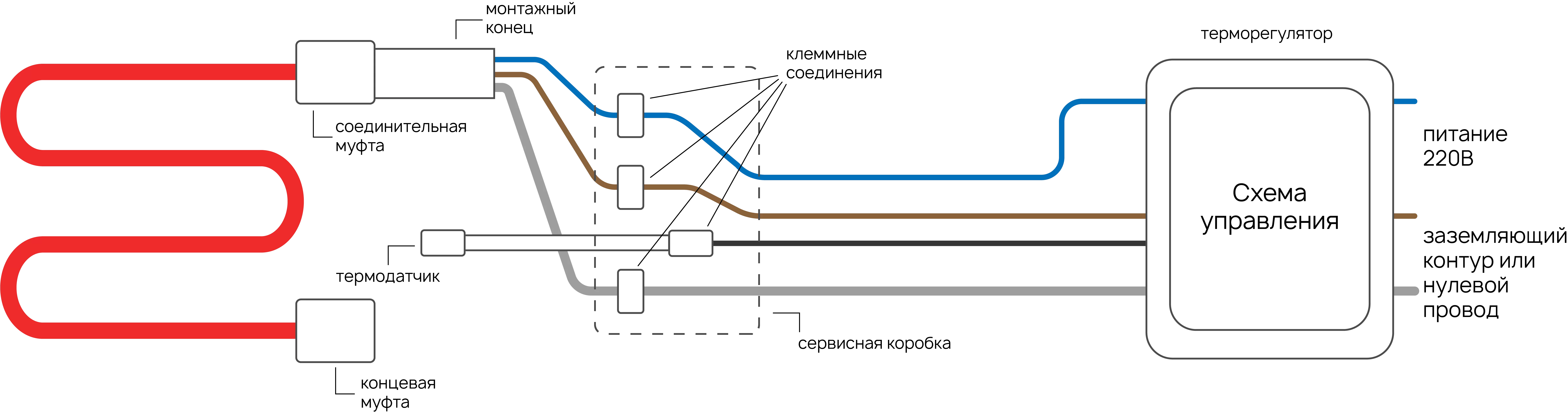 Коричневый и синий провода монтажного конца соеденены с нагревательными жилами кабеля и должны быть подключены к контактам терморегулятора. Желто-зеленый провод монтажного конца соеденен с защитным экраном кабеля. Этот провод необходимо подключить к заземляющему контуру здания (или нулевому проводу).