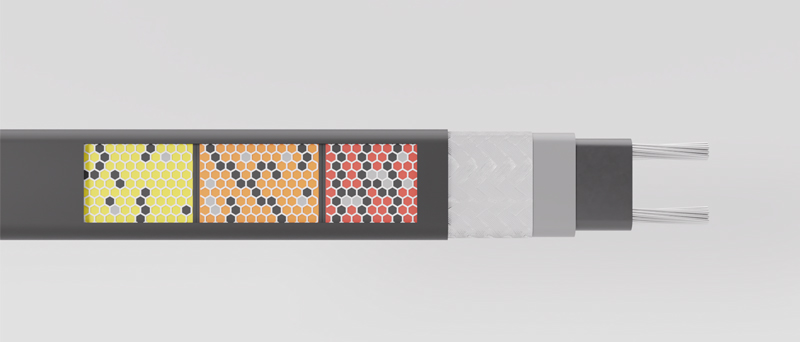 Двухжильный нагревательный кабель оснащен полупроводниковой матрицей из полимерных материалов. При охлаждении матрица сужается и через токопроводящую жилу проходит больше электрического тока, который преобразуется в тепловую энергию.