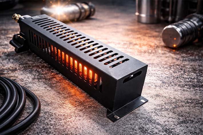 Снаружи обогреватель защищен кожухом. Для конвекции теплого воздуха на нем имеется множество пазов прямоугольной формы, а также установочные опоры, предназначенные для выводов, взрывонепроницаемые полости. Последние закрыты крышками с резьбой.