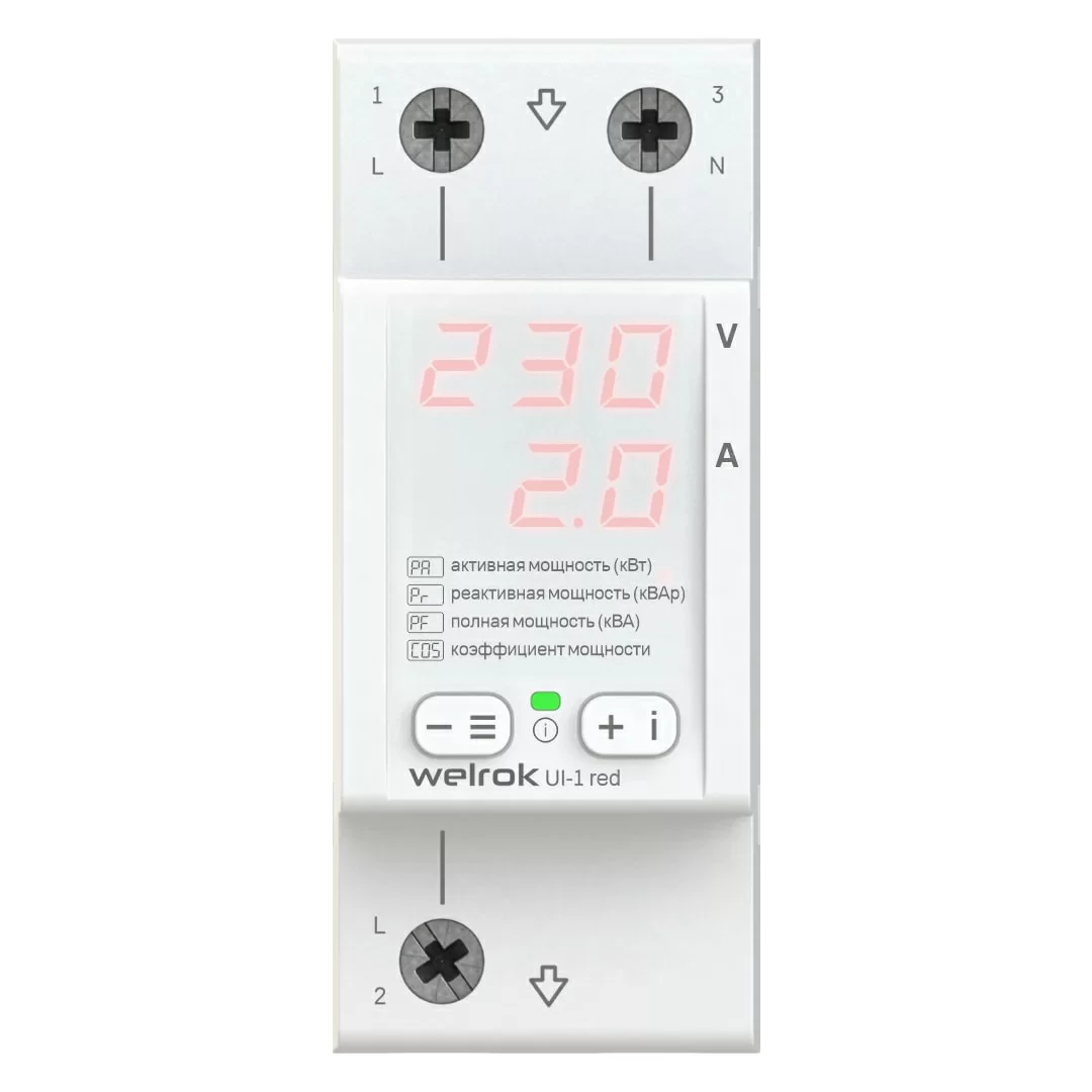 Вольтамперметр Welrok UI-1 red измеряет и отображает все необходимые параметры электросети: напряжение, ток, активную, реактивную и полную мощность. Позволяет оценить коэффициент мощности электросети — cos φ.