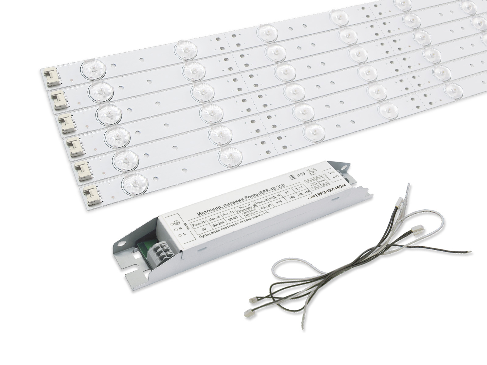 Комплект представляет собой набор из 6 светодиодных линеек Brillare (т.м. D-Luce) с вторичной оптикой, блока питания и соединительных проводов. Благодаря использованию высококачественных электронных компонентов, нашим инженерам удалось добиться высоких световых и электрических показателей.