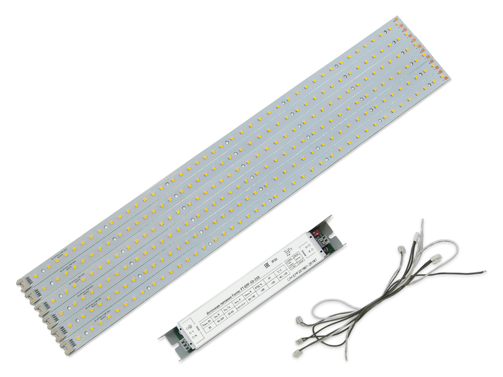 Комплект представляет собой набор из 6 светодиодных линеек Brillare (т.м. D-Luce), блока питания и соединительных проводов. Благодаря использованию высококачественных электронных компонентов, нашим инженерам удалось добиться высоких световых и электрических показателей.