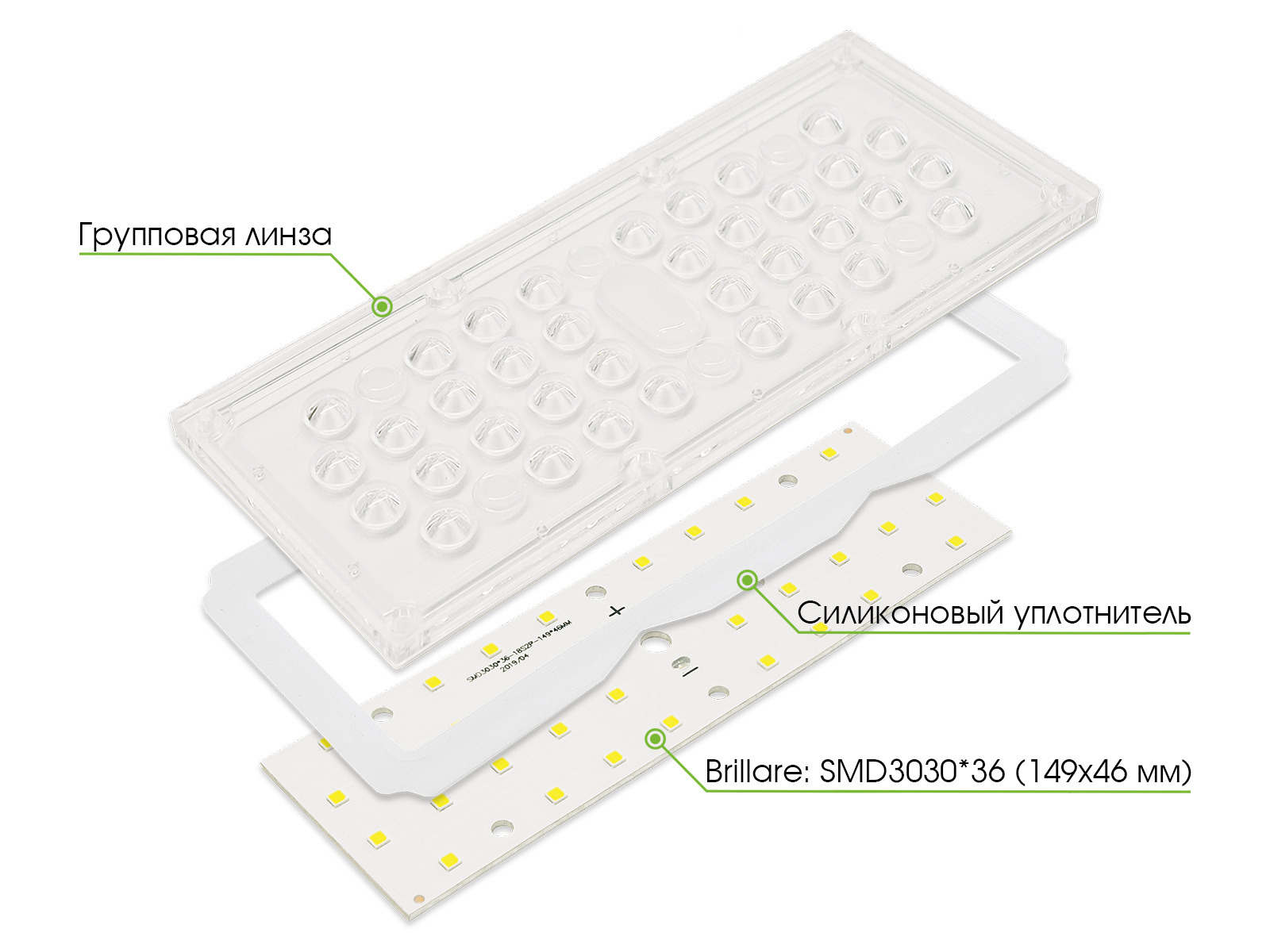 Светодиодный комплект Affina Lens 36 представляет собой набор из светодиодного модуля Brillare: SMD3030*36-149x46 (ТМ D-Luce) и источника питания Fonte: EPF-50-350.
