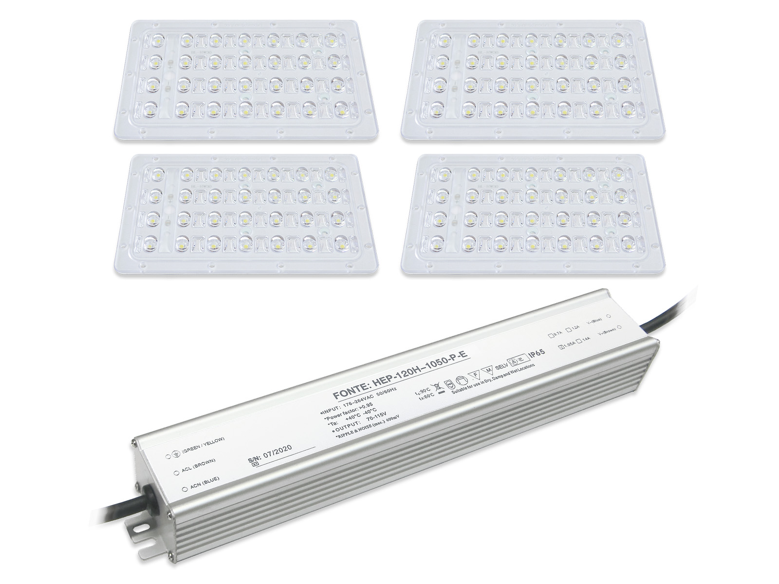 Светодиодный комплект Affina Street Quattro LS представляет собой набор из 4-x светодиодных модулей Brillare: SMD3030*28-129x73 (146°x98°) (ТМ D-Luce) и источника питания Fonte: HEP-120H-1,05-P-E-IP65.
