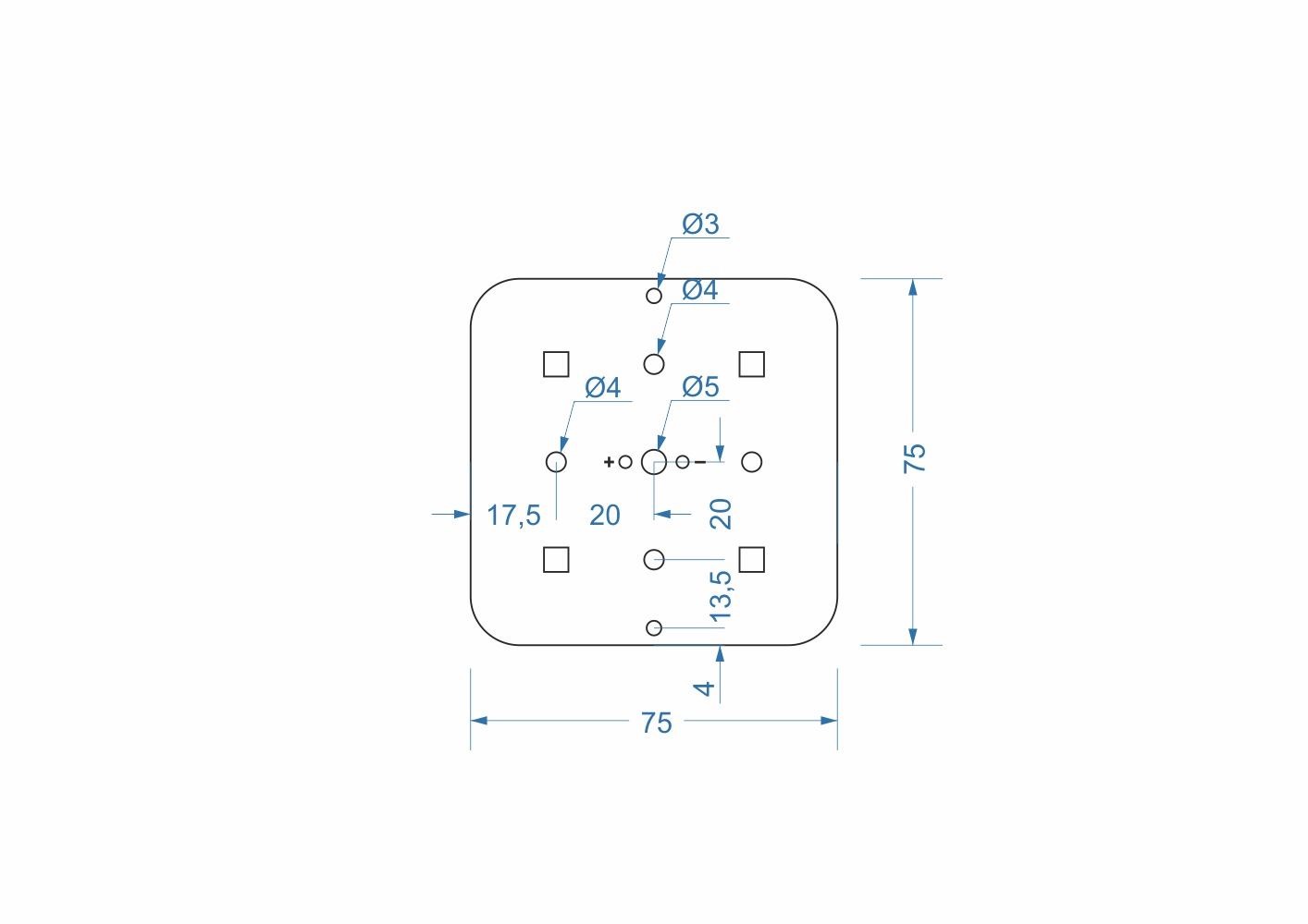 Светодиодный модуль имеет 6 монтажных отверстий для крепления к корпусу светильника или рабочей поверхности (из них 4 отверстия с диаметром 4 мм и 2 с диаметром 3 мм). Для быстрого и безопасного монтажа рекомендуется использовать пластиковые заклепки. В случае использования металлических заклепок рекомендуется использовать изолирующие шайбы, которые препятствуют повреждению изолирующего слоя светодиодного модуля и токоведущих дорожек.