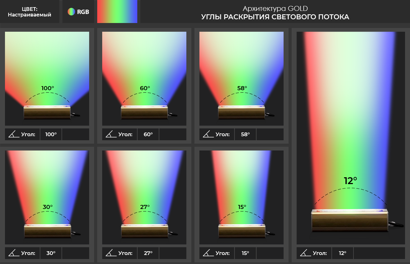 Ш (широкая): Д (косинусная) - 120 градусов; К (Концентрированная) - 15 градусов, 30 градусов, 60 градусов, 90 градусов; Ш (широкая) - 136*78 градусов. |