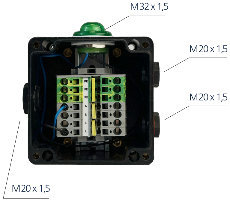 Коробка представляет собой герметичную оболочку с установленными в ней взрывозащищенными кабельными вводами и заглушками, а также клеммами для подключения жил кабелей. В зависимости от типа присоединяемых кабелей могут применяться различные кабельные вводы. В коробке установлен светосигнальный индикатор для индикации работы линии.