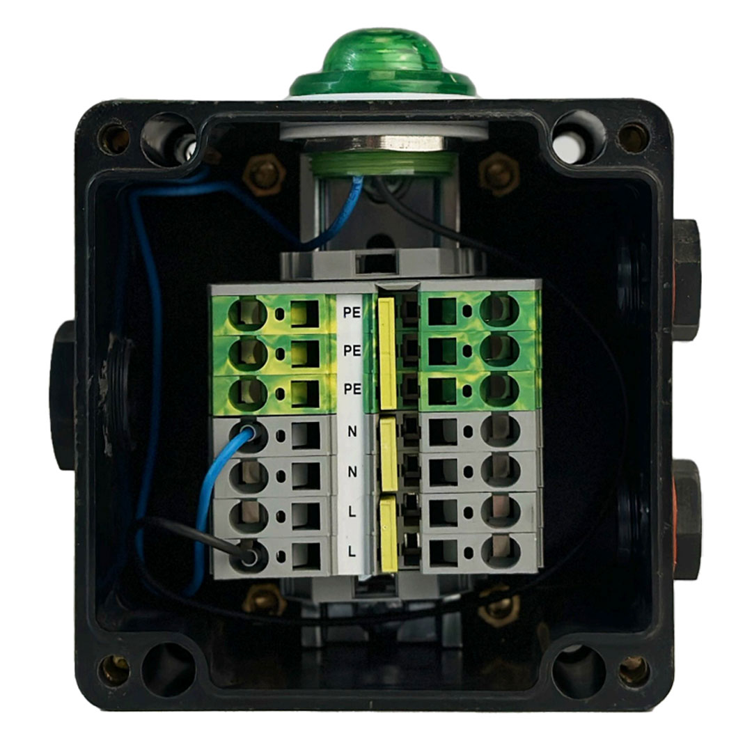 Коробка представляет собой герметичную оболочку с установленными в ней взрывозащищенными кабельными вводами и заглушками, а также клеммами для подключения жил кабелей. В зависимости от типа присоединяемых кабелей могут применяться различные кабельные вводы. В коробке установлен светосигнальный индикатор для индикации работы линии.