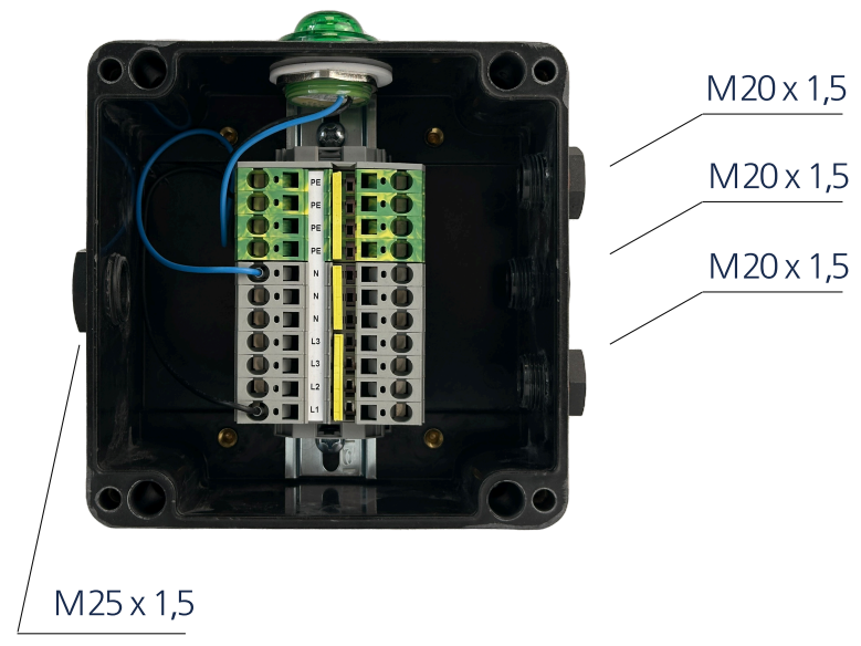 Коробка представляет собой герметичную оболочку с установленными в ней взрывозащищенными кабельными вводами и заглушками, а также клеммами для подключения жил кабелей. В зависимости от типа присоединяемых кабелей могут применяться различные кабельные вводы. В коробке установлен светосигнальный индикатор для индикации работы линии.