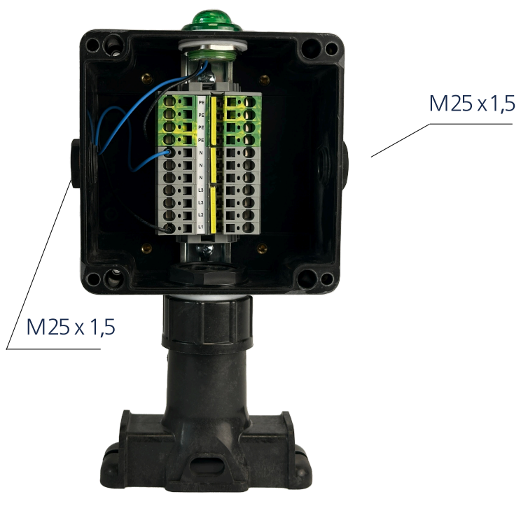 Коробка представляет собой герметичную оболочку с установленными в ней взрывозащищенными кабельными вводами и заглушками, а также клеммами для подключения жил кабелей. В зависимости от типа присоединяемых кабелей могут применяться различные кабельные вводы. В коробке установлен светосигнальный индикатор для индикации работы линии.