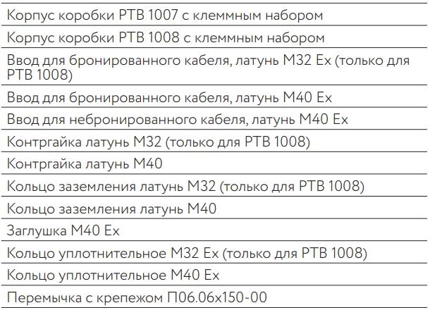 Комплект поставки соединительных коробок РТВ 1007 и 1008:
