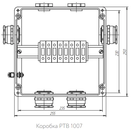 Кабельный ввод коробки РТВ 1007 предназначен для подключения бронированных кабелей диаметром от 23,5 до 33,6 мм. Коробка позволяет выполнить подключение одной секции по схеме «звезда» или «петля». Для удобства подключения нагревательных секций и силовых кабелей и ориентации по месту подключения коробка имеет на каждой стороне отверстие, закрытое заглушкой.