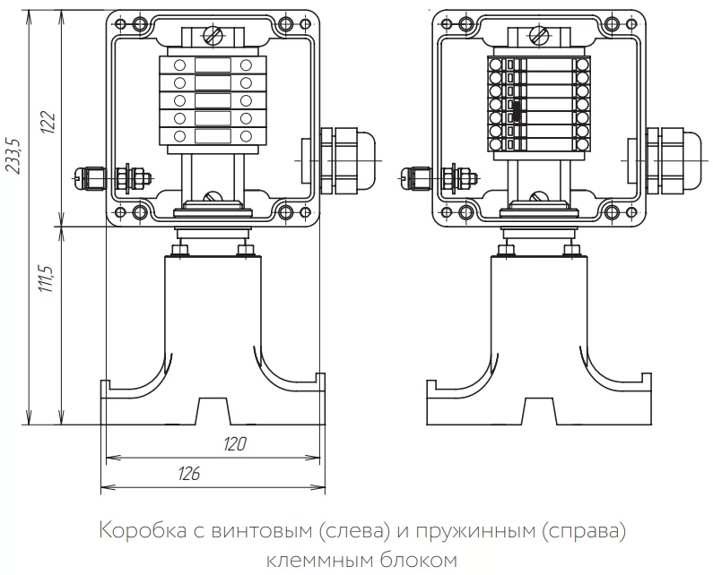 Конструкция корпуса обеспечивает защиту от проникновения влаги и пыли IP66 и высокую коррозионную стойкость. Кабельный ввод коробки предназначен для подключения небронированных силовых кабелей диаметром от 7 до 18 мм или бронированных силовых кабелей диаметром от 12 до 20 мм. Применяемые клеммные наборы позволяют обеспечить подключение многожильных или одножильных проводов сечением от 1,5 до 10 мм². Для заказов доступны исполнения коробок с винтовыми или пружинными клеммными зажимами.
