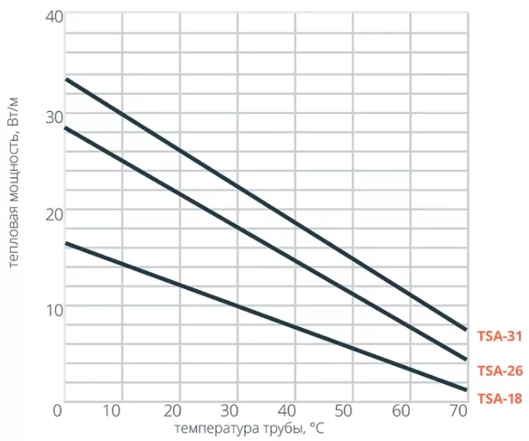 В греющих кабелях TSA нагревательным элементом выступает проводящая матрица, которая способна принимать различные величины сопротивления в зависимости от температуры окружающей среды. Кабели изготавливаются экструзией с равномерным охлаждением, из-за чего по всей длине кабеля мощность и сопротивление распределены равномерно.