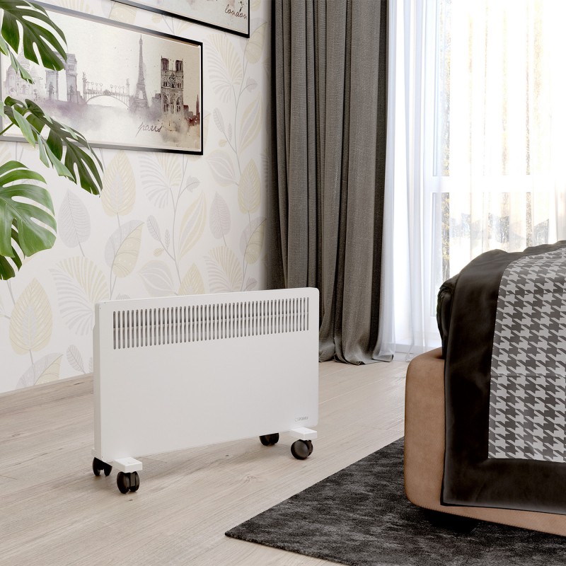 Данный прибор рассчитан на продолжительную работу без надзора при соблюдении правил монтажа и эксплуатации. Корпус не нагревается, что исключает получение бытовых травм и делает его безопасным для детей и питомцев. Для безопасности в корпус электрического конвектора вмонтирован датчик аварийного отключения. Обогреватель работает в одном режиме, с номинальной мощностью 1500 Вт. Для регулировки уровня нагрева есть механический термостат, который поддерживает выбранную вами температуру автоматически включая и выключая прибор.