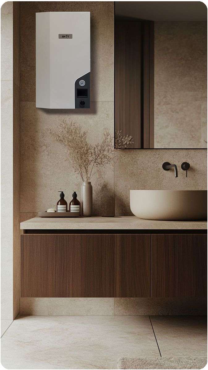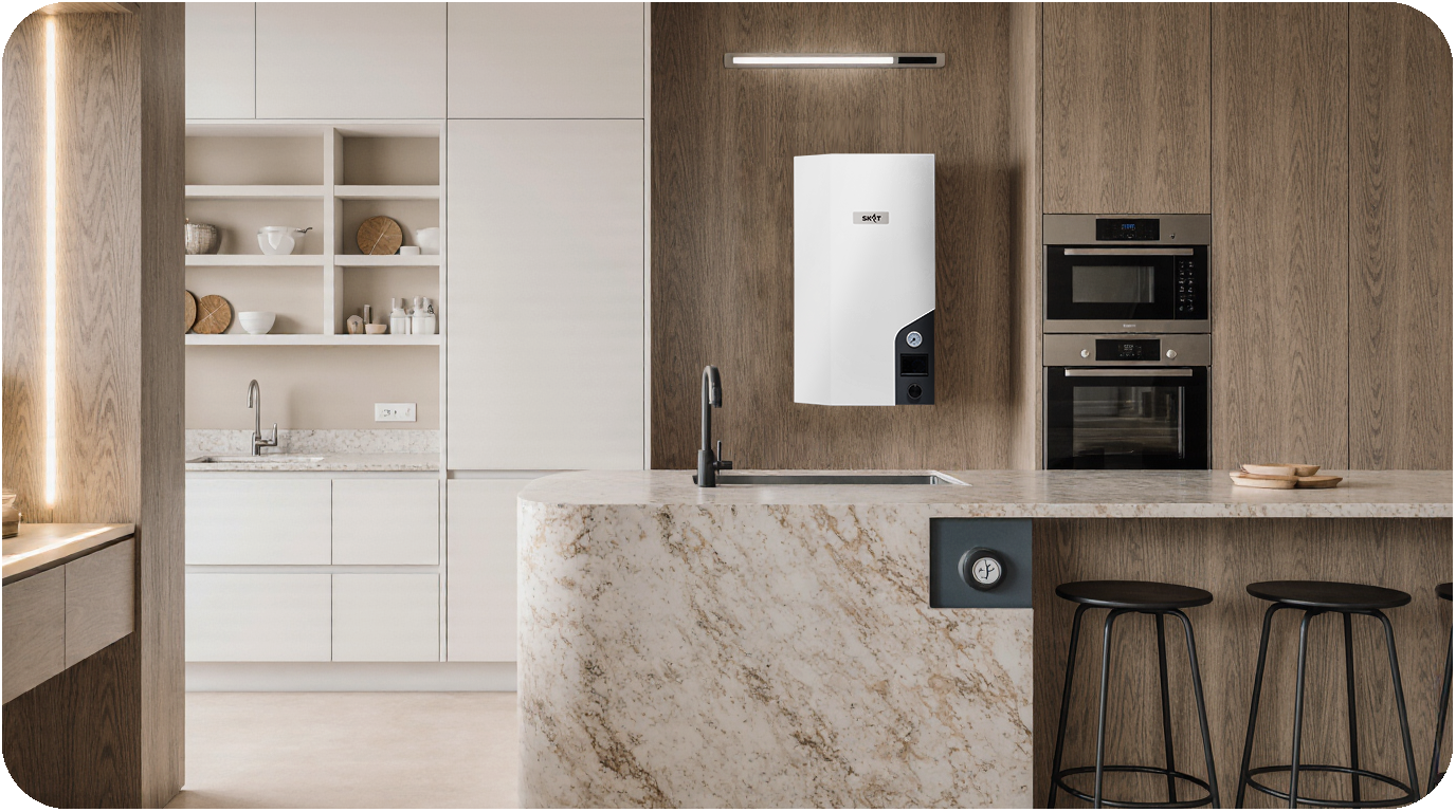 SKAT Gold Alum – это готовое решение для отопления и организации горячего водоснабжения. Расширительный бак, насос и группа безопасности уже внутри компактного корпуса котла. Сухой ТЭН, который прослужит дольше. Надежное и тихое симисторное управление Opentherm.