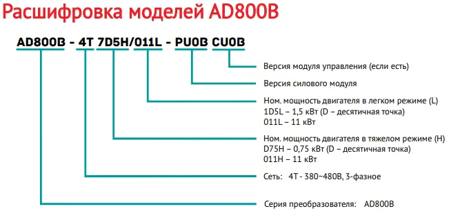 За основу берется силовой модуль AD800B-…-PU0B и, если требуется, устанавливается модуль управления (CU0B или CU00) и/или подключается выносной пульт управления. На преобразователях частоты AD800B-…-PU0BCU0B возможна замена установленного модуля управления CU0B на CU00.
