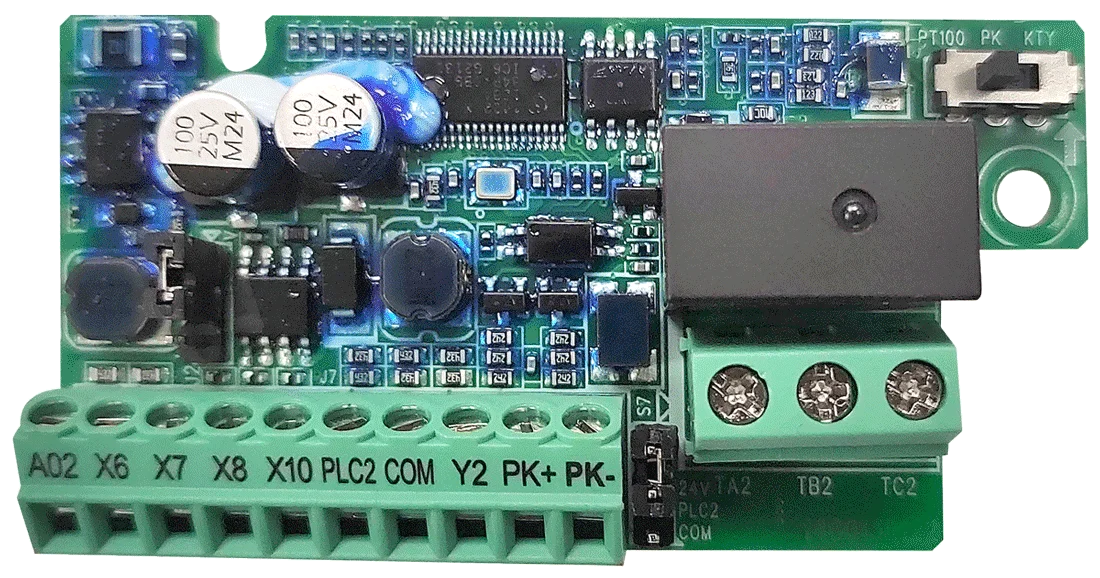 Плата ПВВ1 позволяет увеличить штатные входы/выходы ПЧВ на 1 аналоговый выход, 4 цифровых входа, 1 релейный выход, 1 цифровой выход, 1 вход датчика PT100/PT1000/KTY. Плата предназначена для работы с ПЧВ3 [M01].