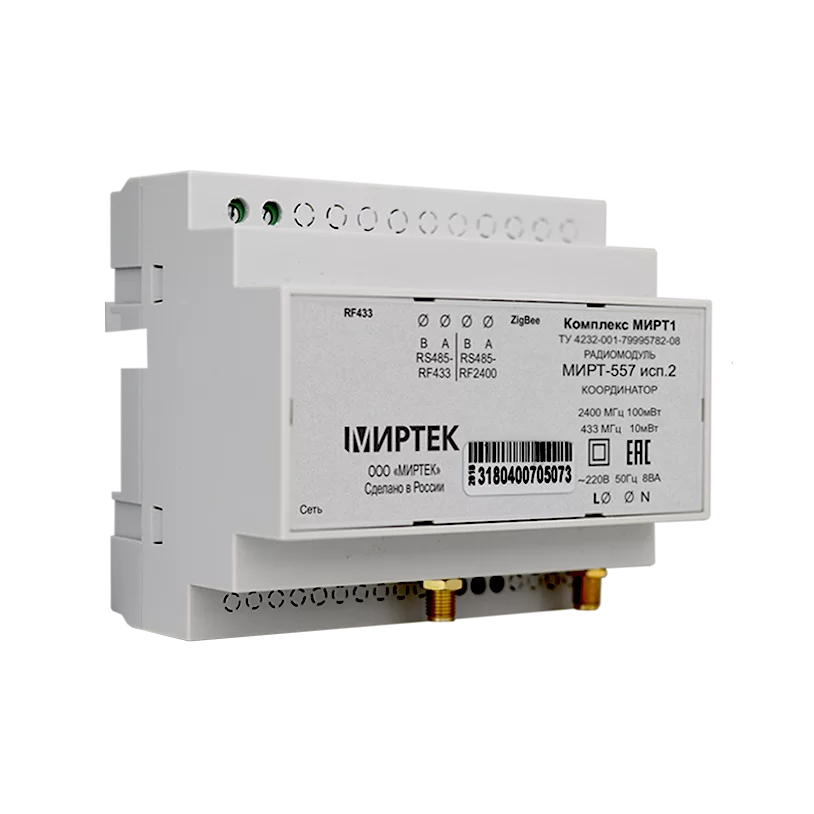 Координатор МИРТ-557 исп.2 предназначен для управления MESH-сетью в радиоканале 433 МГц и 2400 МГц. Обеспечивает прозрачный доступ к устройствам MESH-сети, а также позволяет управлять устройствами в автоматическом и ручном режиме. Использует полосу частот в диапазоне 433 МГц, имеет мощность 10 мВт; полосу частот в диапазоне 2400 МГц, имеет мощность 100 мВт, в связи с чем не требуется получение разрешений на использование радиочастот и оформление регистрации радиоэлектронных средств. Имеет два разъёма SMA для подключения выносных антенн на диапазон 433 МГц и 2400 МГц соответственно. Тип интерфейса координатора с аппаратурой проводного канала связи – два раздельных RS-485 для радиоканала 433 МГц и 2400 МГц соответственно.