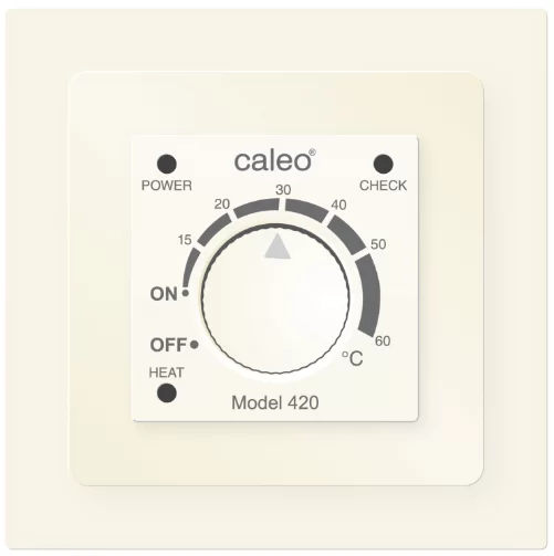 Встраиваемый, аналоговое управление, 3,5 кВт. Выдерживает перепады напряжения от 100 до 240 В и отлично подойдет для регионов, где возможны перепады напряжения. Модель обладает простым интуитивно понятным аналоговым управлением, что делает ее незаменимой для покупателей пожилого возраста.Терморегулятор оснащен функцией самодиагностики канала датчика температуры (если датчик не подключен или вышел из строя, то на передней панели загорается индикатор «CHECK»). Благодаря съемной рамке и набору адаптеров, терморегулятор CALEO 420, совместим с декоративными рамками известных производителей, таких как: ABB (серия Basic 55), Legrand (серии Valena и Suno), Gira, Jung (серия ACreation и Eco Profi), Simon (серия 15), Schneider Electric (серии UNICA, UNICA QUADRO и UNICA Studio подходят без адаптера, а для Schneider Electric Atlas Design используется адаптер Gira, Jung).
