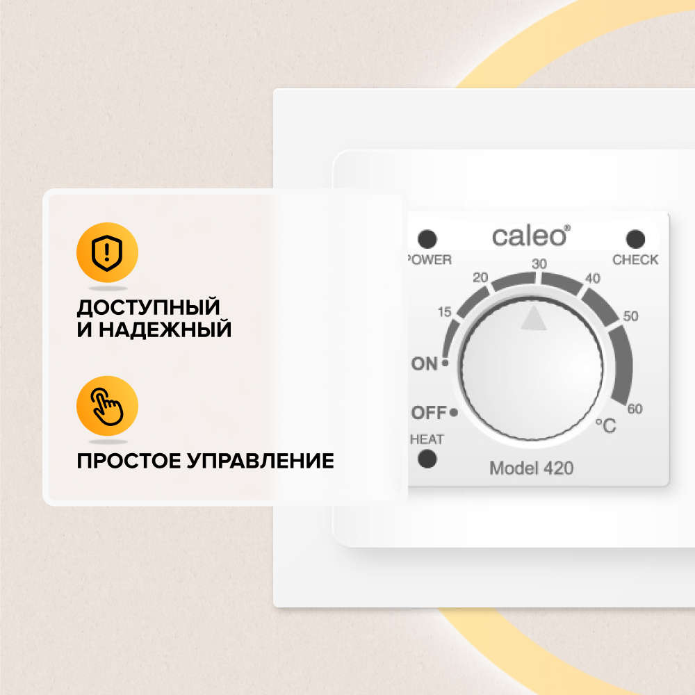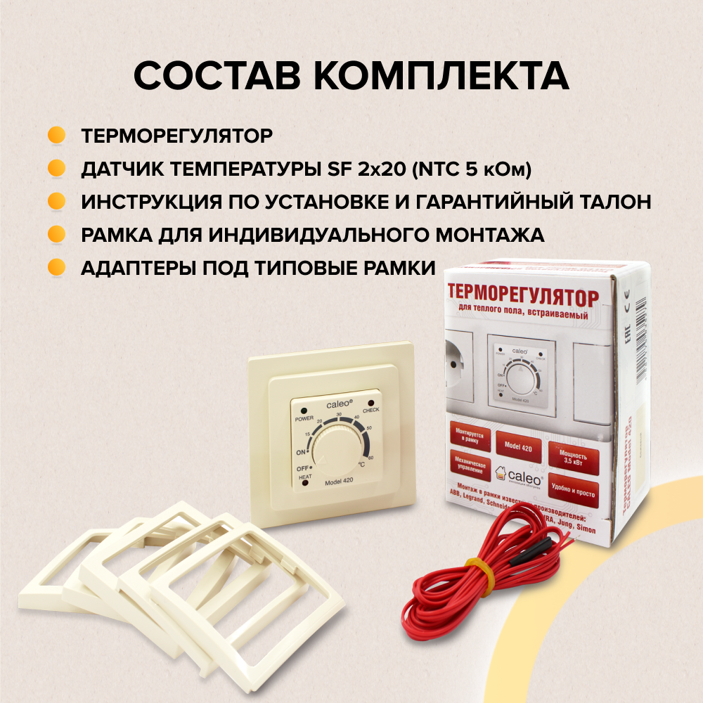 Встраиваемый, аналоговое управление, 3,5 кВт. Выдерживает перепады напряжения от 100 до 240 В и отлично подойдет для регионов, где возможны перепады напряжения. Модель обладает простым интуитивно понятным аналоговым управлением, что делает ее незаменимой для покупателей пожилого возраста.Терморегулятор оснащен функцией самодиагностики канала датчика температуры (если датчик не подключен или вышел из строя, то на передней панели загорается индикатор «CHECK»). Благодаря съемной рамке и набору адаптеров, терморегулятор CALEO 420, совместим с декоративными рамками известных производителей, таких как: ABB (серия Basic 55), Legrand (серии Valena и Suno), Gira, Jung (серия ACreation и Eco Profi), Simon (серия 15), Schneider Electric (серии UNICA, UNICA QUADRO и UNICA Studio подходят без адаптера, а для Schneider Electric Atlas Design используется адаптер Gira, Jung).