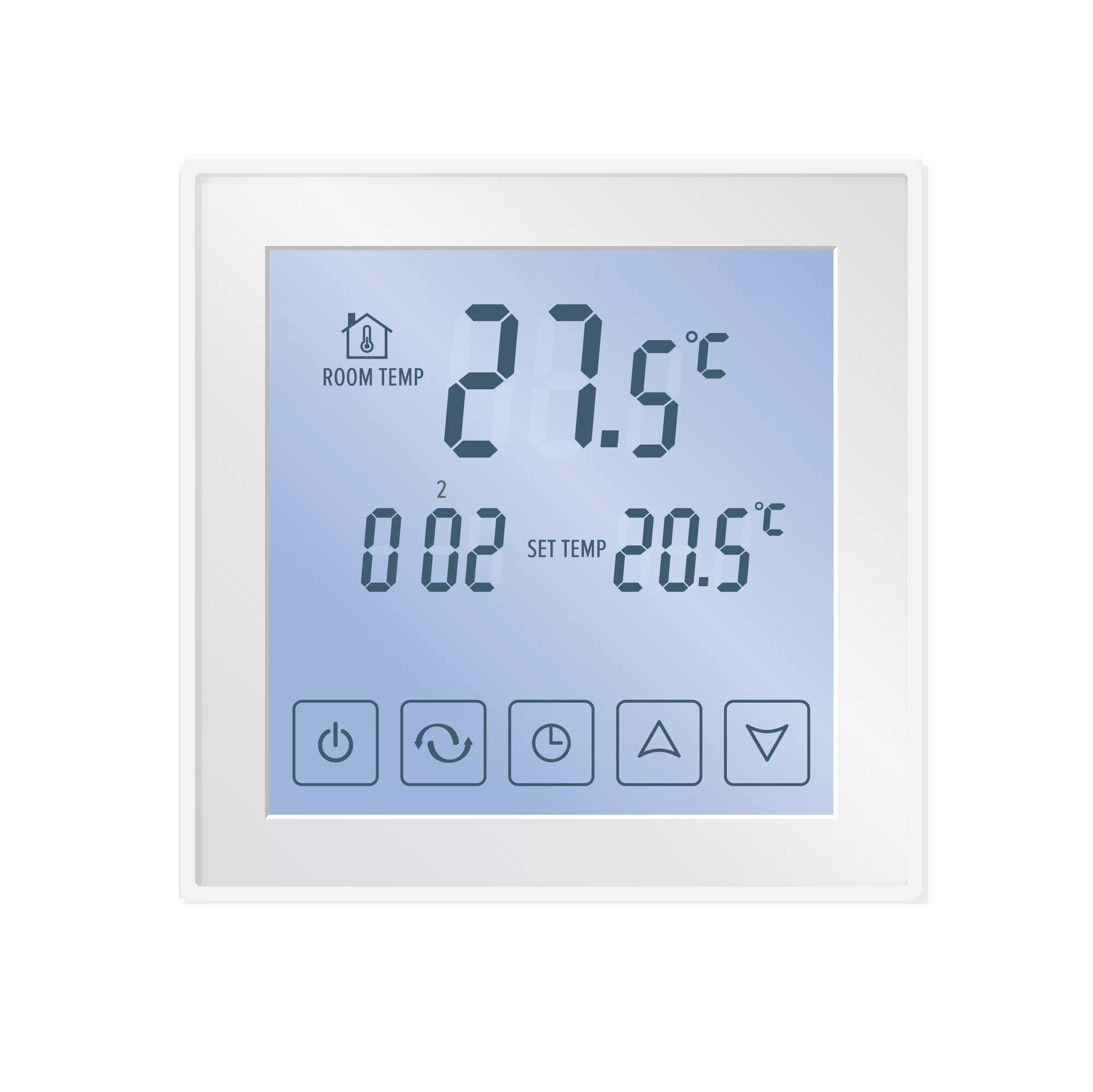 Встраиваемый цифровой программируемый терморегулятор с сенсорным управлением. Имеет большой информативный сенсорный экран с бледно-голубой подсветкой и блокировку клавиатуры.