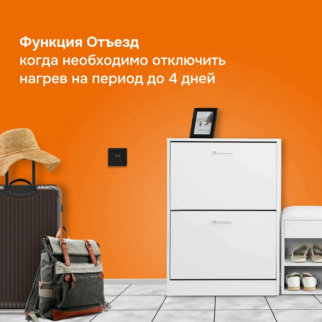 Термостат Welrok lis дополнительно экономит электроэнергию благодаря функции Отъезд и счетчику времени работы нагрузки. Функция Отъезд, при необходимости, позволяет отключить нагрев длительностью до 4-х суток. Счетчик времени работы нагрузки позволяет проанализировать расходы на обогрев и при необходимости изменить температуру комфорта