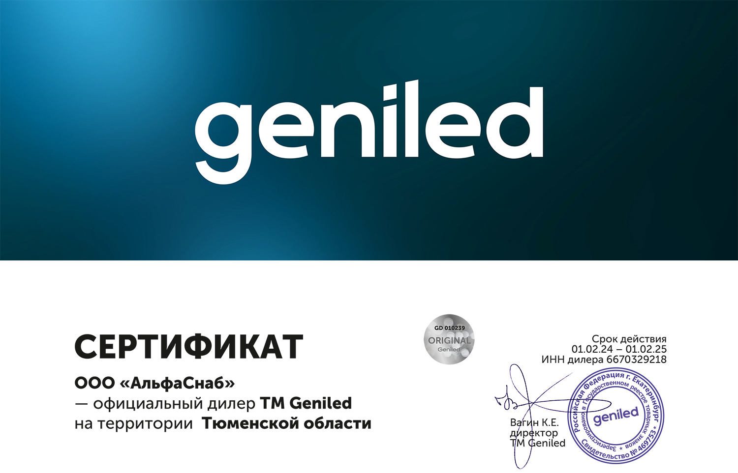 Сертификат ТМ Geniled для ООО "АльфаСнаб" на Тюменскую Область, до 01.02.2025