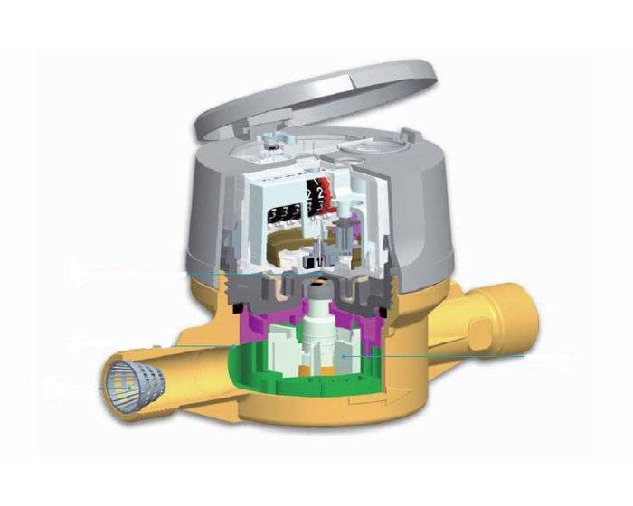 В многоструйных счетчиках поток на входе в прибор разделяется на несколько потоков для уменьшения турбулентности – тем самым снижая погрешность измерения, но увеличивая цену. Также счетчики разделяются на счетчики воды мокрого и сухого типа.