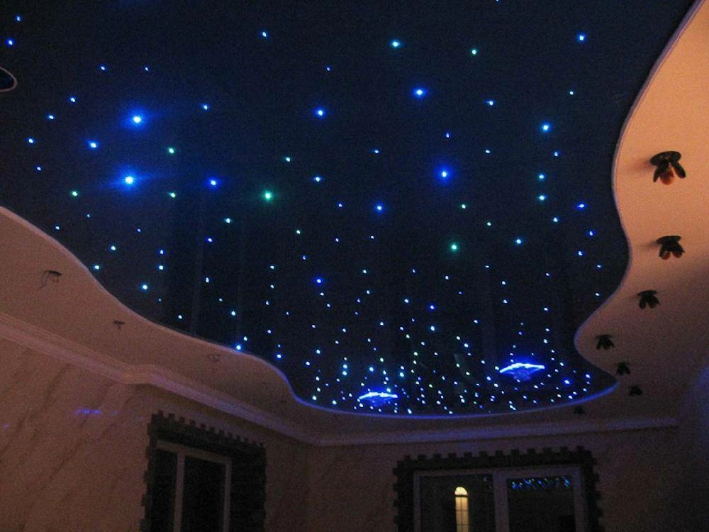 Существует также интересный, и в своем роде уникальный натяжной потолок под названием «Звездное небо». Он уже содержит готовое осветительное решение, организованное так, как задумал хозяин помещения. В «Звездном небе» реализованы различные комбинации полотна для натяжного потолка и осветительных элементов, подбором которых можно создать настоящую световую симфонию.